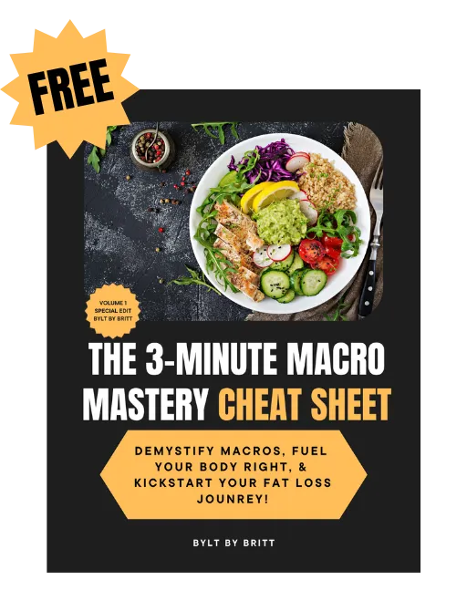 Download Britt’s 3-Minute Macro Mastery Cheat Sheet and finally understand what to eat, why it matters, and how to build meals that actually support your goals, without complicated tracking or cutting your favorite foods.